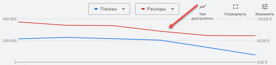 Отметим: у Торговой кампании дневной бюджет был установлен более высокий, однако израсходовать его в полной мере она не смогла и в сравнении с ее работой до подключения Performance Max принесла меньший объем трафика по большей стоимости.