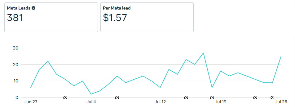 За месяц мы получили здесь 381 лид со средней стоимостью 1,57$.